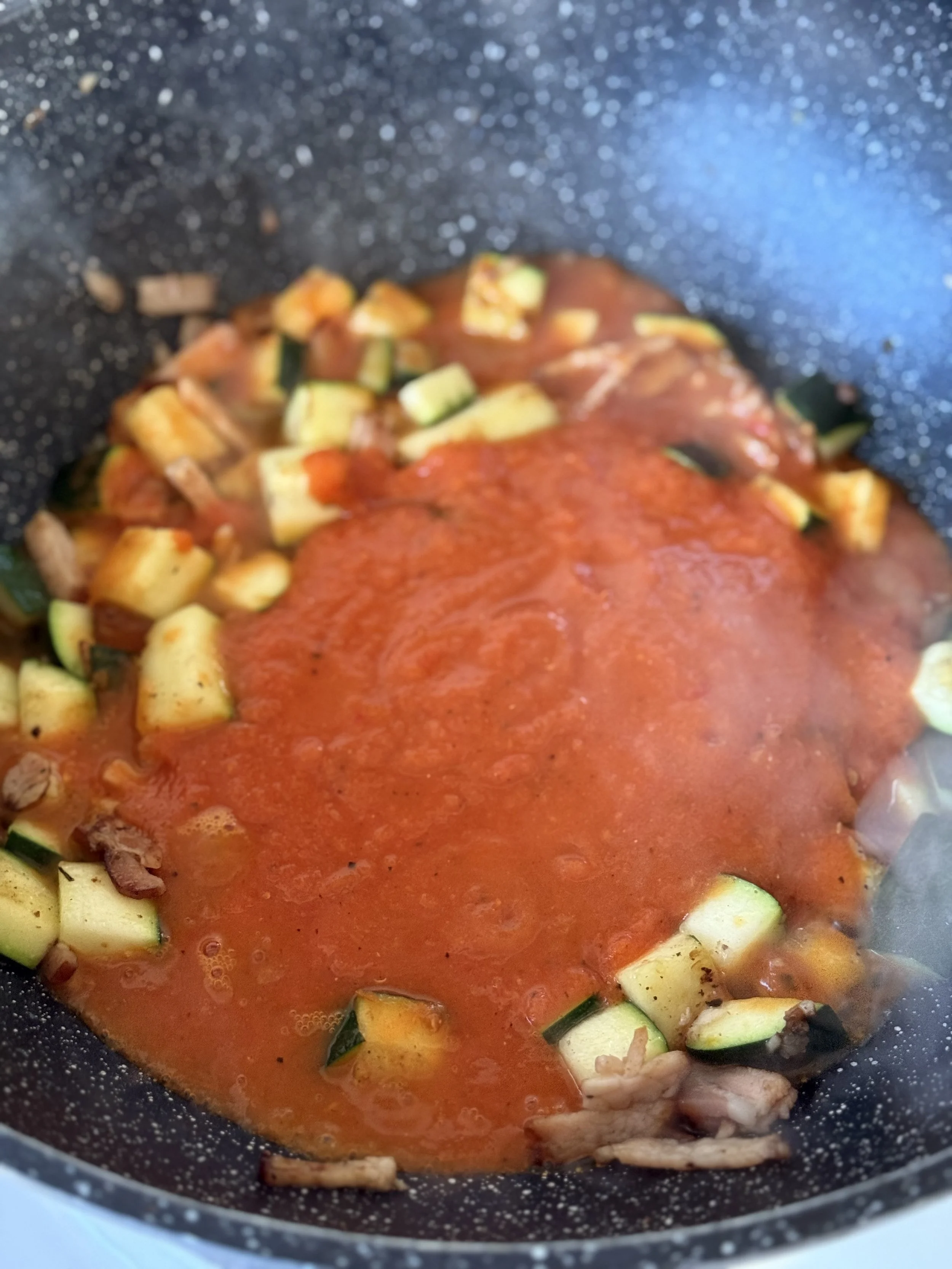 On a medium - high heat with a small bit of oil fry the bacon and zucchini at the same time until browned.