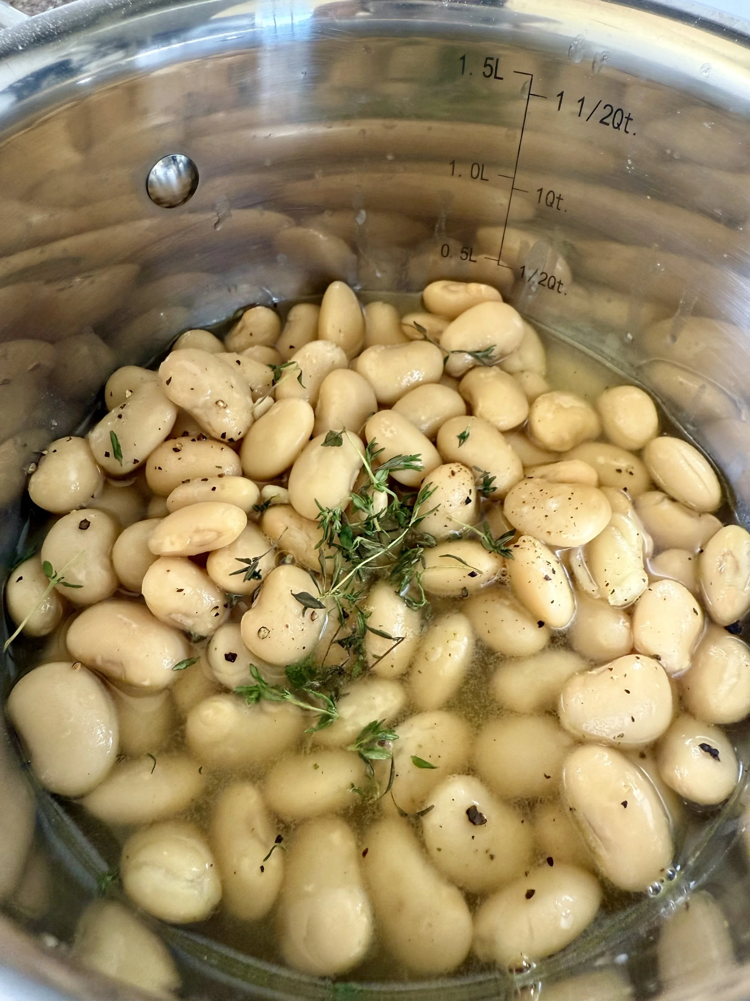 Add a few sprigs of thyme and the beans with the 1/4 - 1/2 a can of liquid to a saucepan and heat for a few minutes until warm.