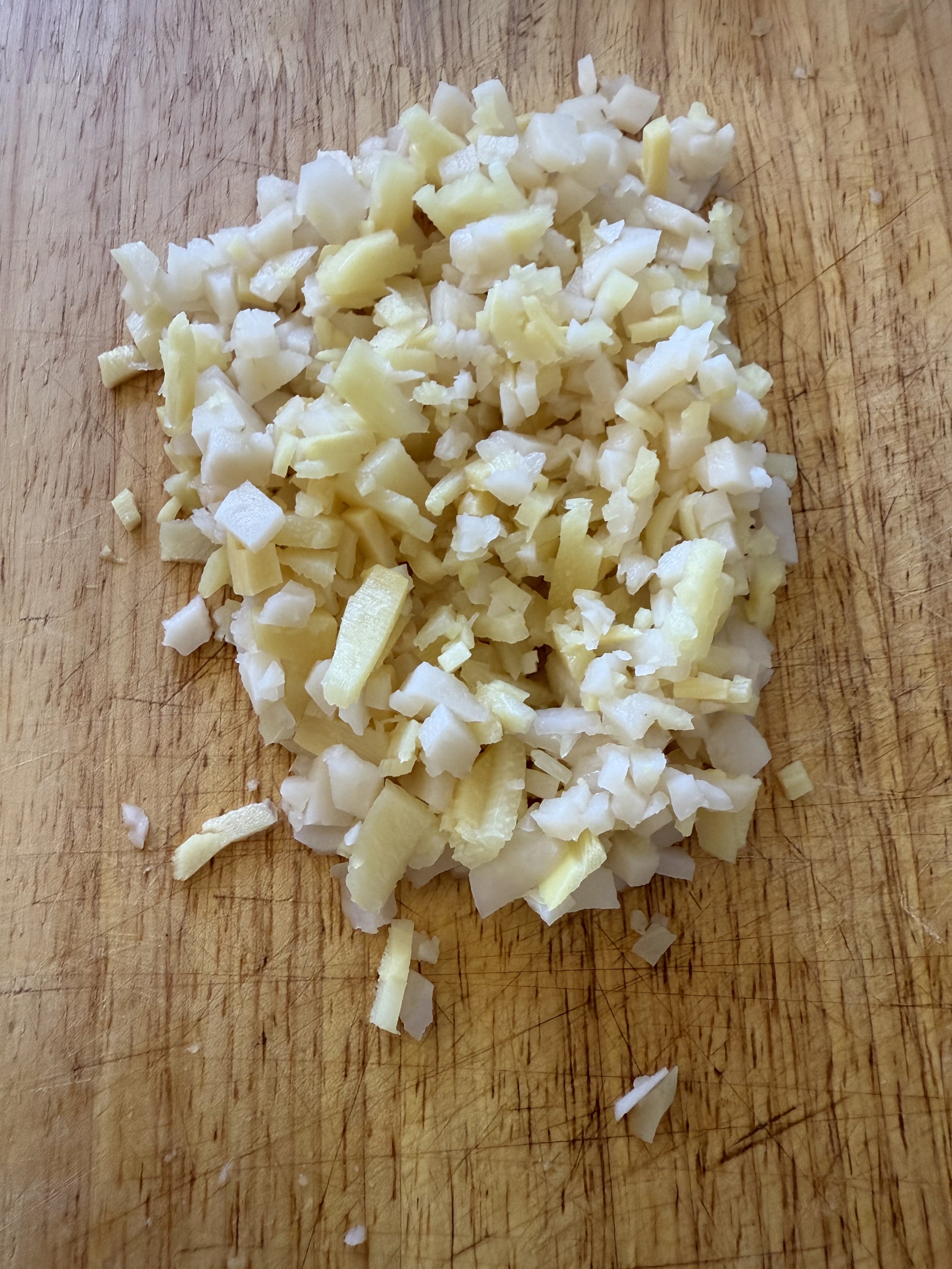 Finely chop the water chestnuts and bamboo shoots and set aside.