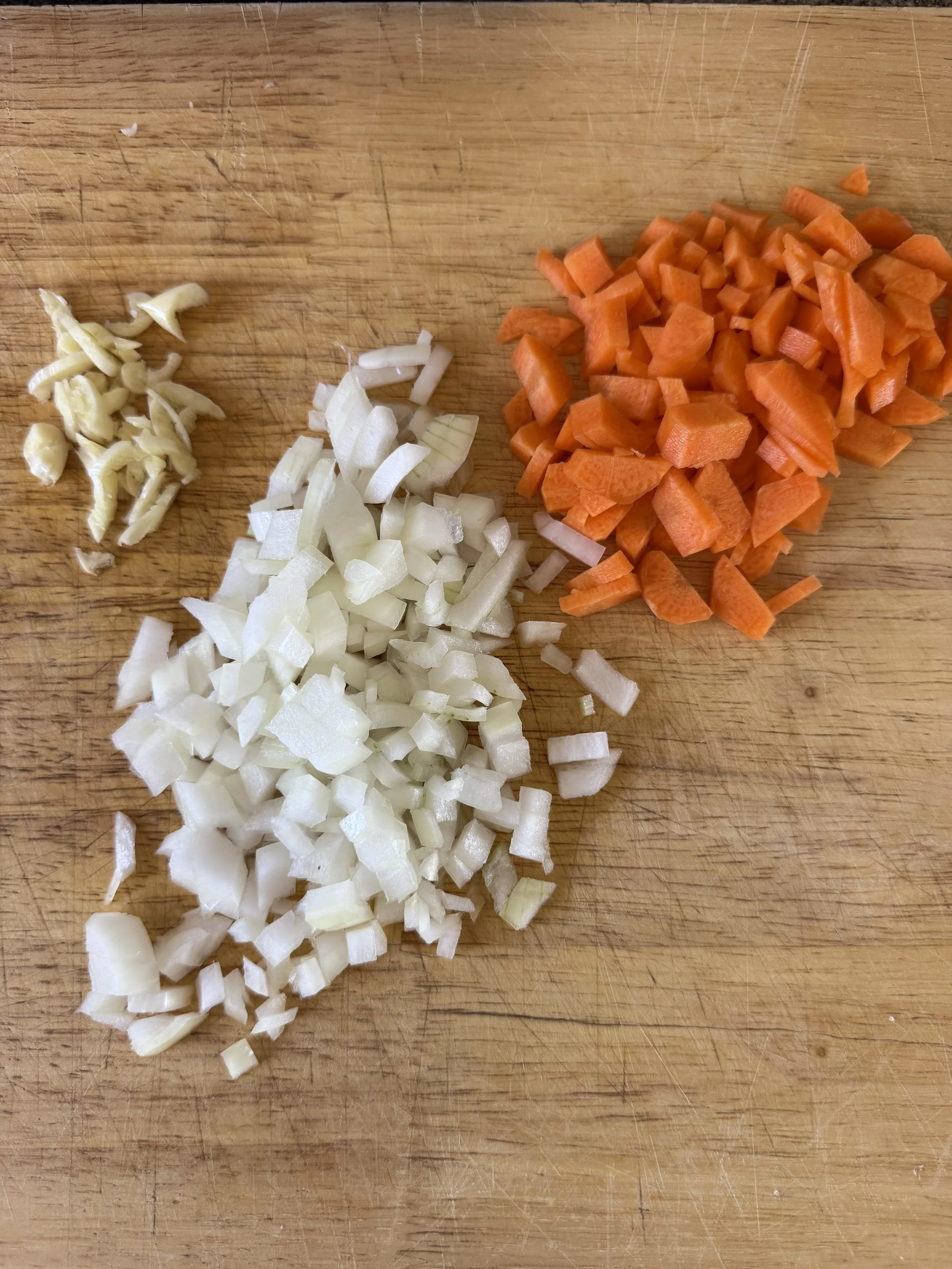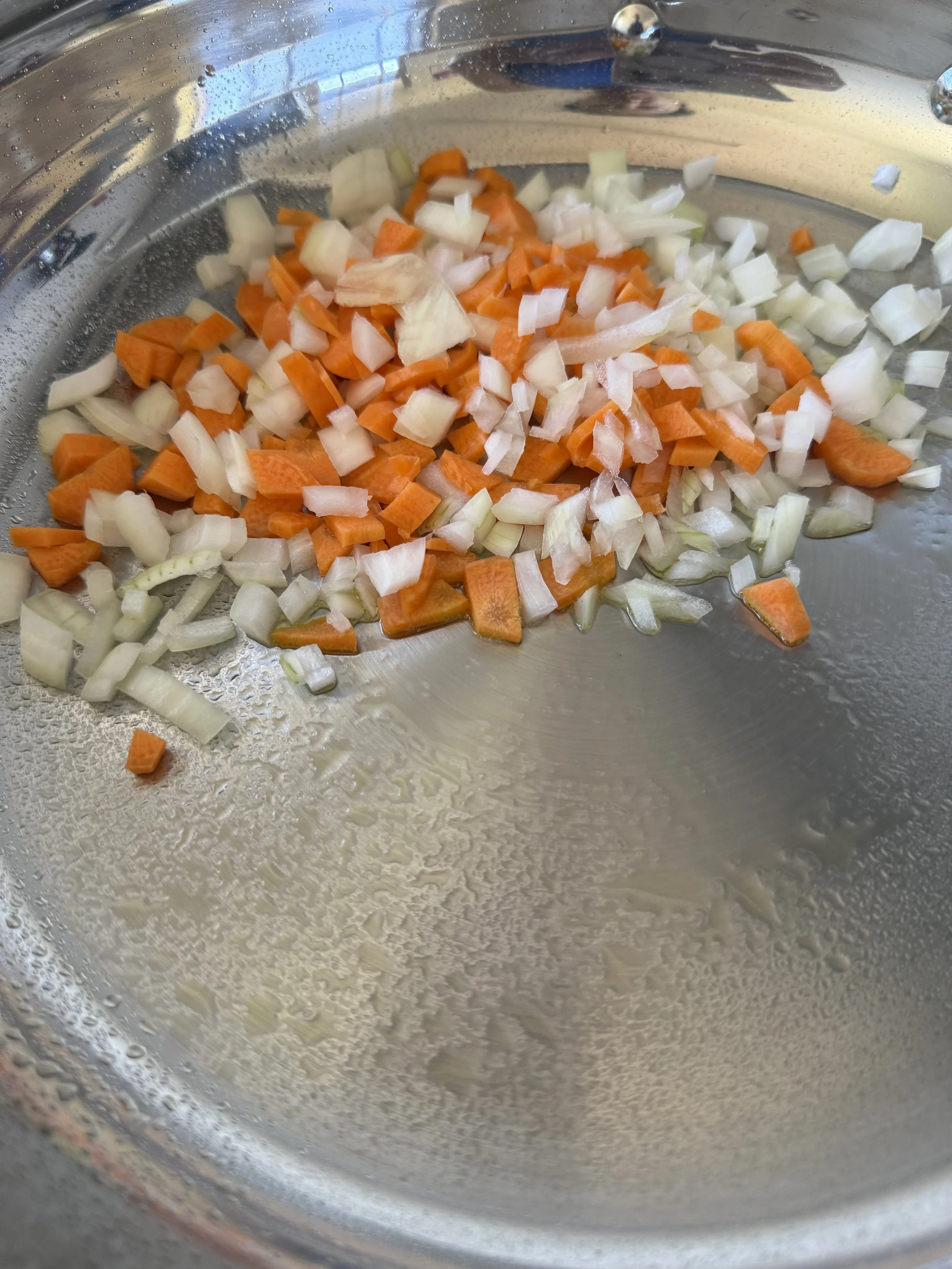 On a medium heat with sesame or virgin olive oil in a pan, fry the garlic, carrot and onion for 1 minute.