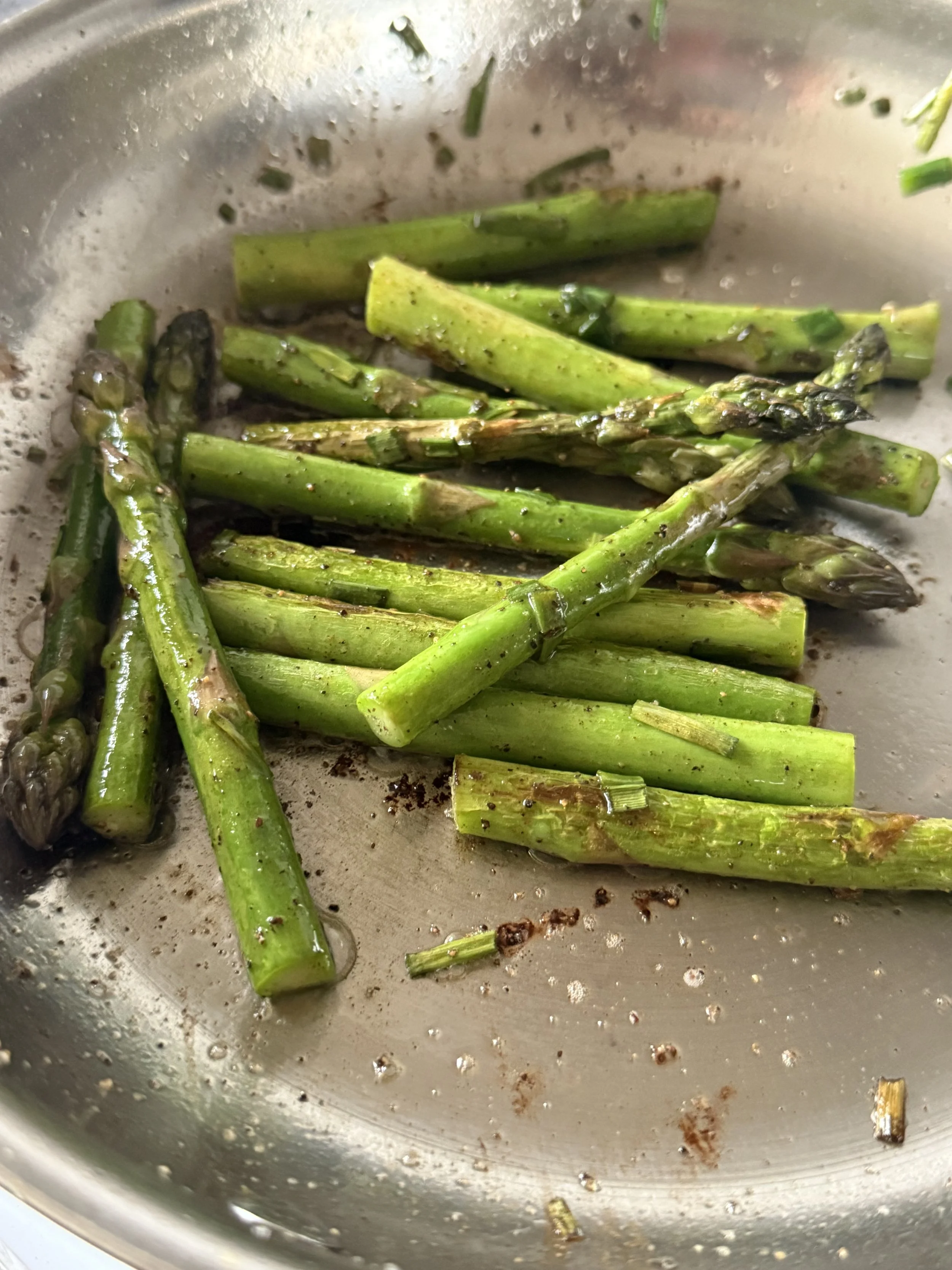 On a medium heat fry the asparagus in the oil for 5 minutes until brown, put the lid on the pan to help the steam cook through the aspargus.