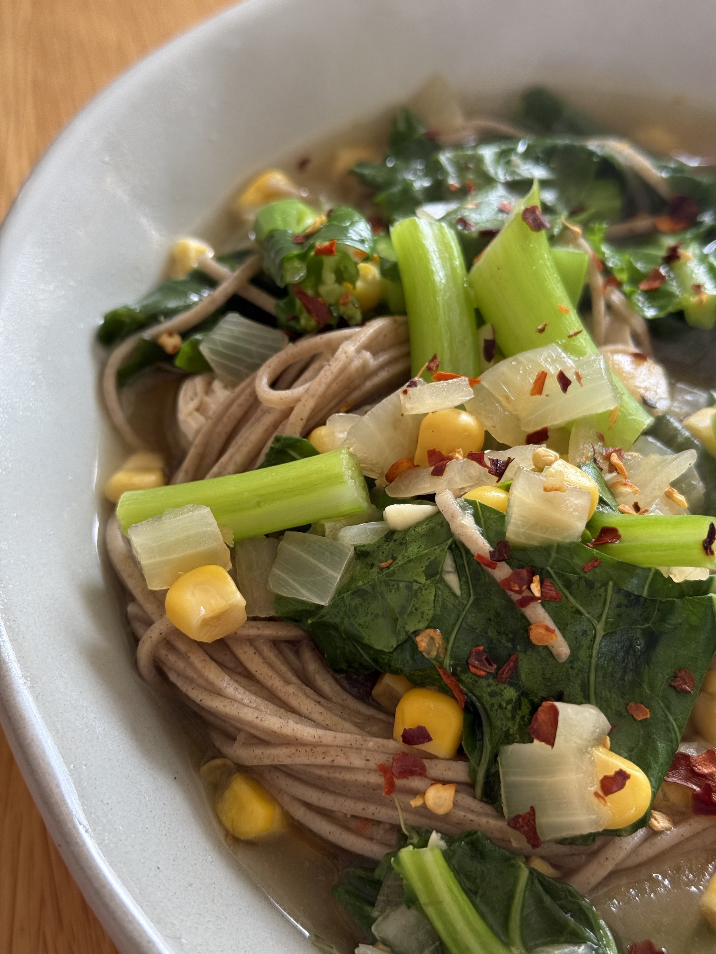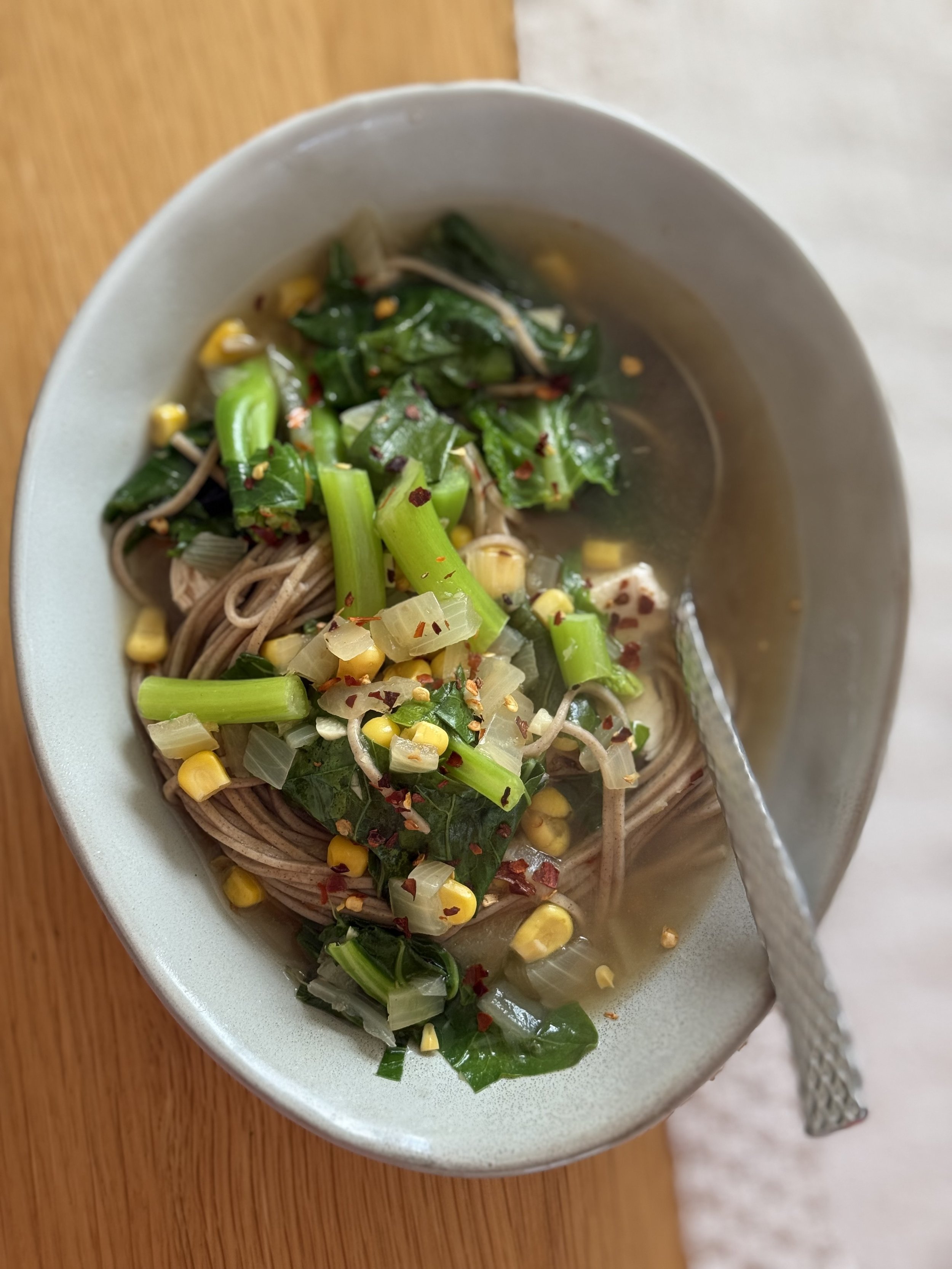 Optional - you can also add in cooked soba noodles and the greens and let them steam cook with the lid on whilst the soup is off.