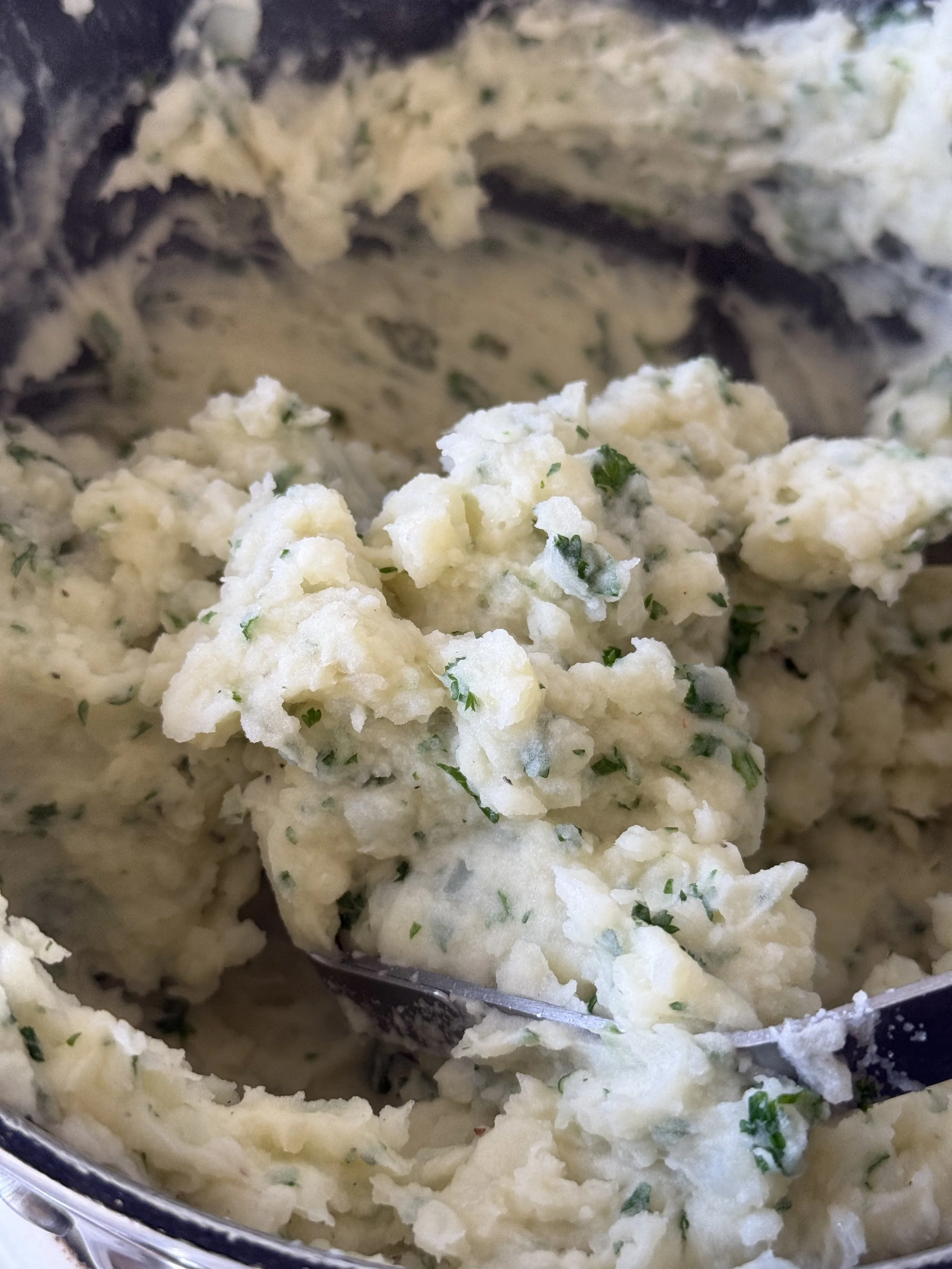 Mash the potatoes in a sauce pan with a small bit of butter, the herbs and milk and leave to cool.
