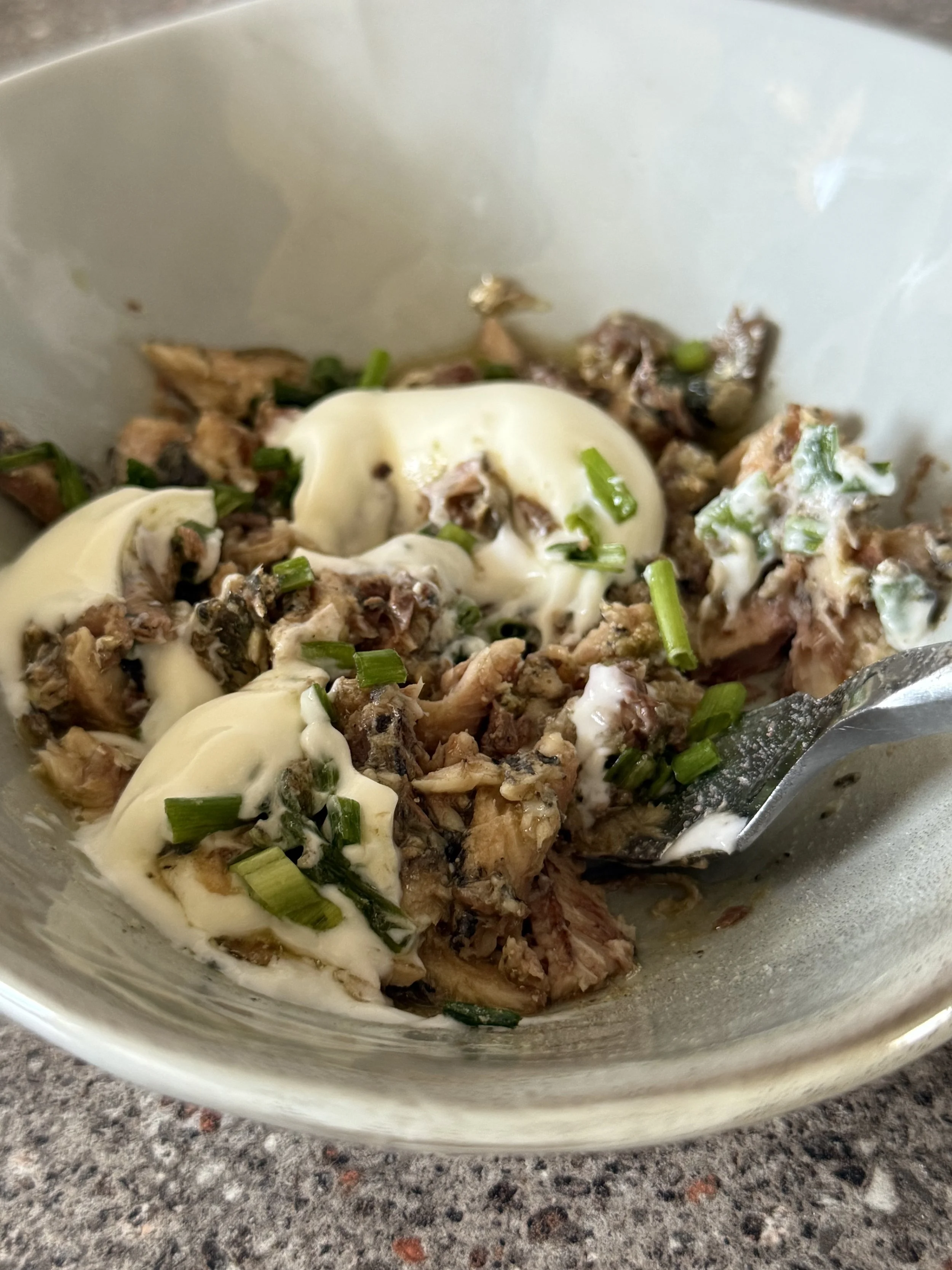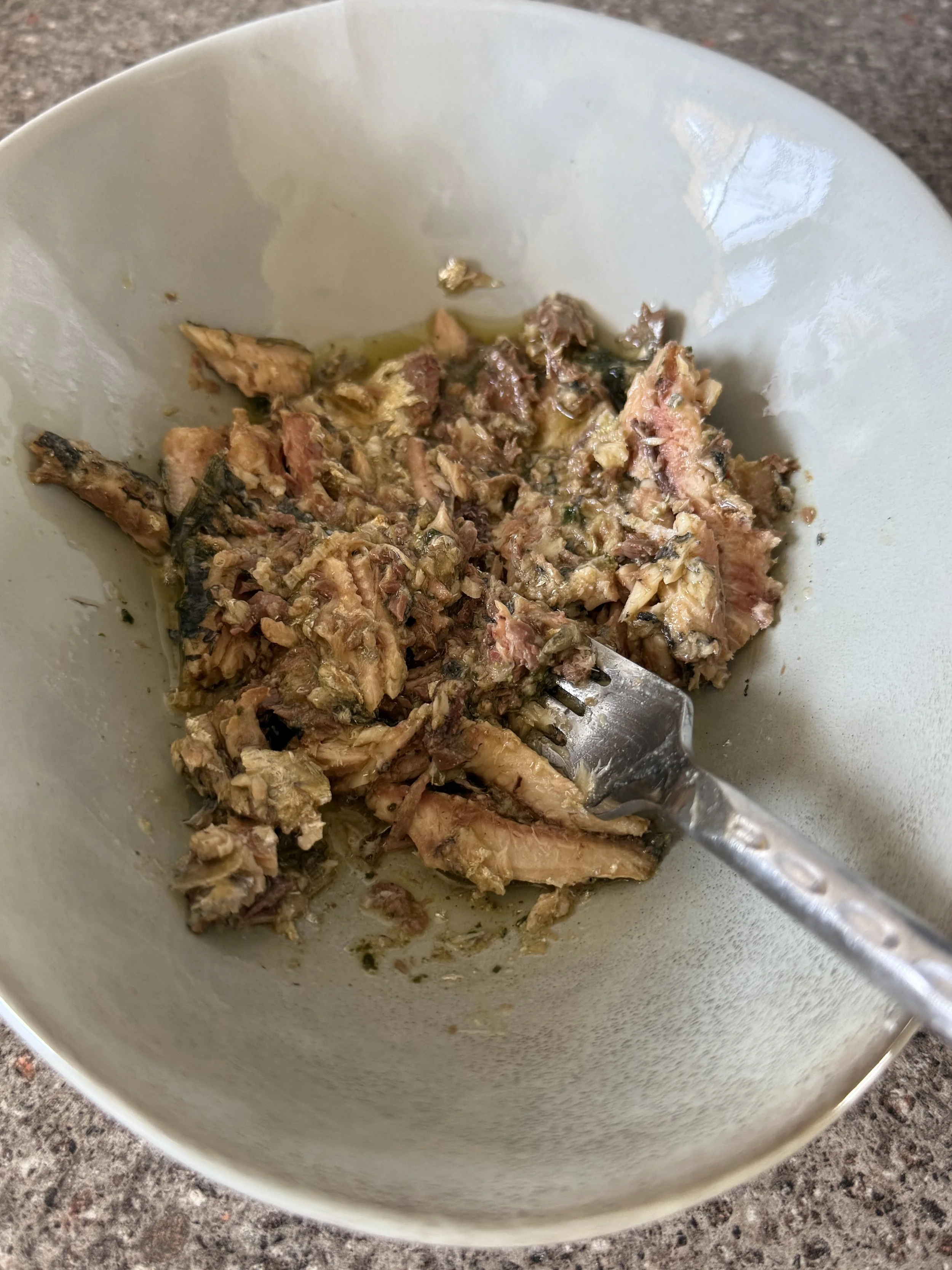 Drain the sardines and put in a bowl. Add in 2 Tbsp. of Greek yoghurt, chopped chives, salt, pepper and squeeze of lemon.